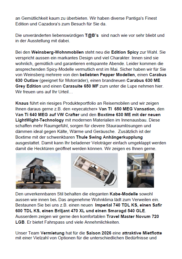 Das ganze Jahr präsentieren wir Ihnen knapp 100 Fahrzeuge in unserer grossen Ausstellung und eine breite Palette mit neuen Reisemobilen und Wohnwagen. Gerne zeigen wir Ihnen die verschiedensten Grundrissvarianten und beraten Sie umfassend, damit Sie das passende Fahrzeug wählen.