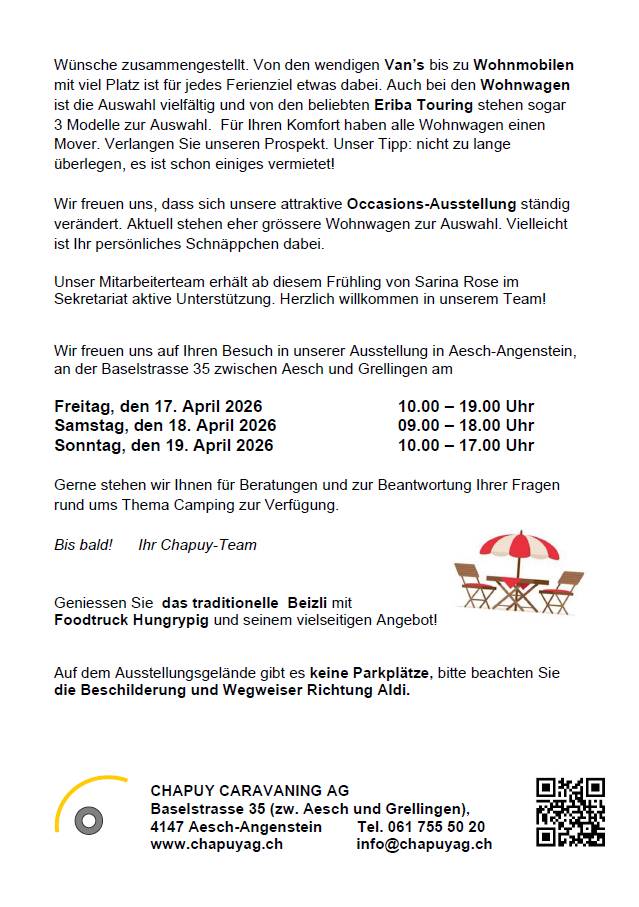 Profitieren Sie von der über 60-jährigen Berufserfahrung beim grössten Händler in der Nordwestschweiz, bei Ihrem Chapuy Caravaning Team.